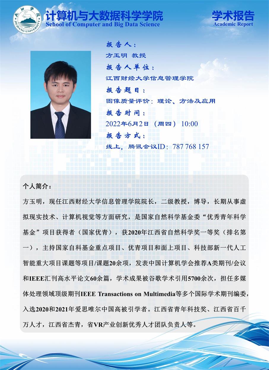 方玉明,现任江西财经大学信息管理公司经理,二级教授,博导,长期从事虚拟现实技术、计算机视觉等方面研究,是国家自然科学基金委“优秀青年科学基金”项目获得者(国家优青),获2020年江西省自然科学奖- -等奖(排名第一),主持国家自科基金重点项目、优青项目和面上项目、科技部新一代人工智能重大项目课题等项目/课题20余项,发表中国计算机学会推荐A类期刊/会议和IEE汇刊高水平论文60余篇,学术成果被谷歌学术引用5700余次,担任多媒体处理领域顶级期刊IEEE Transactions on Multimedia等多个国际学术期刊编委,入选2020和2021年爱思唯尔中国高被引学者。江西省青年科技奖、江西省百千万人才,江西省杰青,省VR产业创新优秀人才团队负责人等。