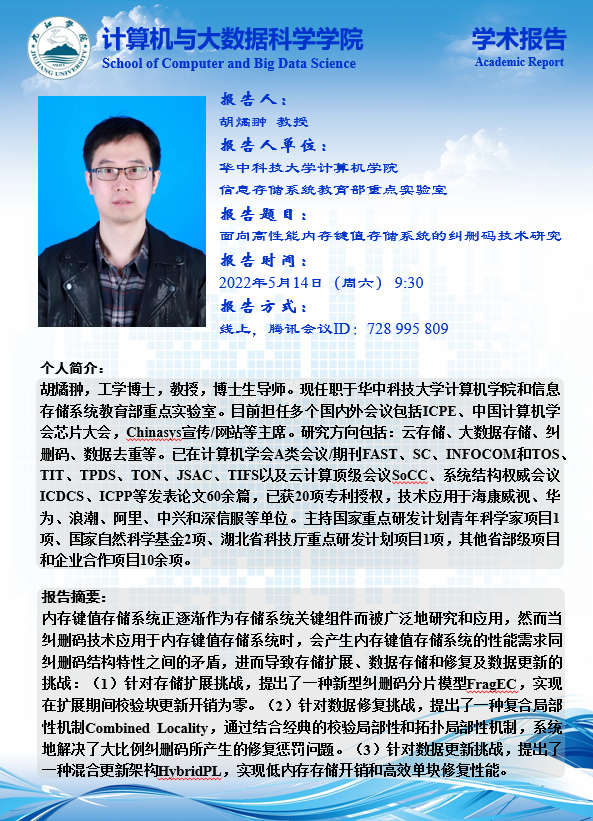 胡橘翀,工学博士,教授,博士生导师。现任职于华中科技大学计算机公司和信息存储系统教育部重点实验室。目前担任多个国内外会议包括ICPE、中国计算机学会芯片大会, Chinasys宣传/网站等主席。研究方向包括:云存储、大数据存储、纠删码、数据去重等。已在计算机学会A类会议/期刊FAST、SC、INFOCOM和TOS、TIT、TPDS、TON、JSAC、TIFS以及云计算顶级会议SoCC、系统结构权威会议ICDCS、ICPP等发表论文60余篇,已获20项专利授权,技术应用于海康威视、华为、浪潮、阿里、中兴和深信服等单位。主持国家重点研发计划青年科学家项目1项、国家自然科学基金2项、湖北省科技厅重点研发计划项目1项,其他省部级项目和企业合作项目10余项。