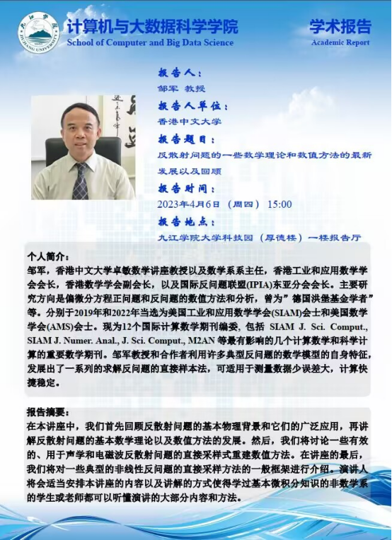 2023年4月6日学术报告(邹军 教授,香港中文大学)
