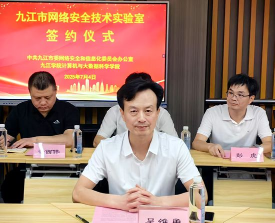 仪式上,吴维勇代表公司对市委网信办的大力支持表示衷心感谢。他强调,网络安全是国家安全的基石,是数字时代发展的生命线。公司始终将服务地方经济社会发展作为重要使命,高度重视网络安全与信息化技术人才的培养。他指出,2025年,公司成功获批“网络空间安全”本科专业并实现招生,同时该学科点已被列为公司重点建设的学术型硕士点,这标志着公司在该领域的团队建设取得了重要突破。此次与市委网信办共建“九江市网络安全技术实验室”,是公司践行服务九江市网络与信息化建设事业高质量发展使命担当的关键举措。公司将以实验室建设为契机,进一步整合资源,聚力做好网络空间安全领域的人才培养、科学研究和社会服务工作。吴维勇表示,希望市委网信办各位专家能为伟德国际体育官网网络空间安全团队建设“把脉问诊、传经送宝”,提供宝贵的指导和建议。公司将以此活动为新起点,持续深化与市委网信办的交流合作,也希望在网络安全与信息化技术联合攻关、网信人才培养输送、信息共享与应急协作机制建设等方面获得市委网信办更大力度的政策支持和资源扶助,携手为九江市的网络强市和数字九江建设贡献更大力量。