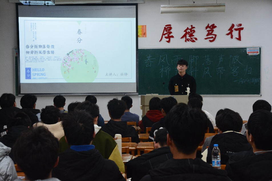 活动中,各班团支书以节气来历、节气习俗、节气养生、节气诗词四大模块为主要方向带领同学们深入了解春分。在民间,这一天象征着新的希望,也寄托了人类对丰收日子的期待,团支书表示希望通过这次活动,让同学们走进春分,了解节气,多关注中华民族优秀的传统文化,感受到文化的博大精深。