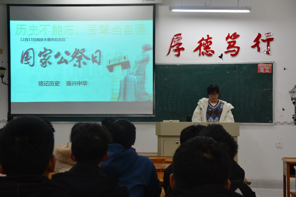 为纪念南京大屠杀遇难同胞,加强公司广大学子的爱国主义教育,12月15日晚,计算机公司于文友楼各班教室开展“历史不能忘,吾辈当自强”主题团日活动,此次活动由各班团支书主持,全体大一员工参加。