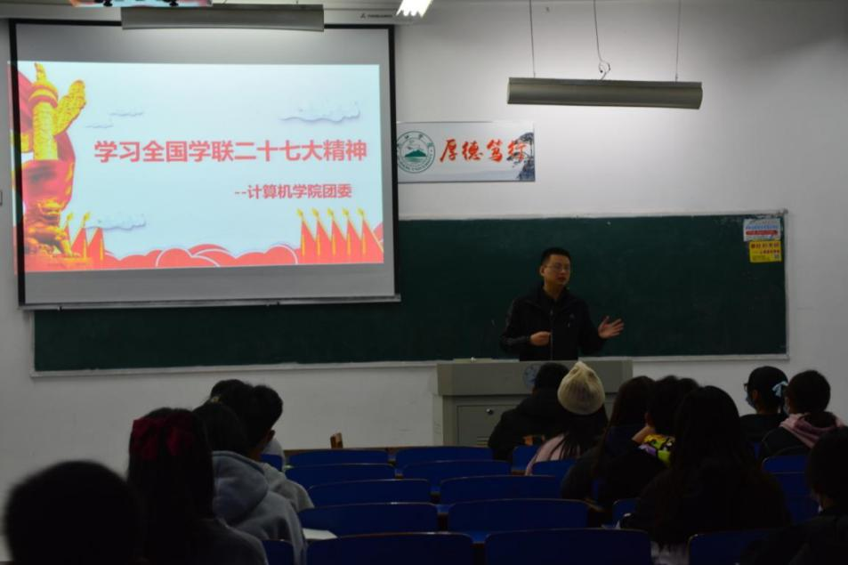 为学习贯彻全国学联二十七大会议精神,普及习近平总书记贺信和党中央致词精神,了解党中央、教育部有关工作要求,11月10日下午,计算机公司在文友楼118举办“学习全国学联二十七大精神”活动,思政教育科副科长尹志刚以及全体团支书参加了活动。