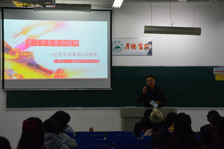 为纪念辛亥革命110周年,弘扬红色文化,提高同学们爱国主义意识,11月10日,计算机公司于文友楼118开展“学习辛亥革命精神”主题讲座,此次讲座由思政教育科副科长尹志刚主讲,计算机公司全体团支书参加。
