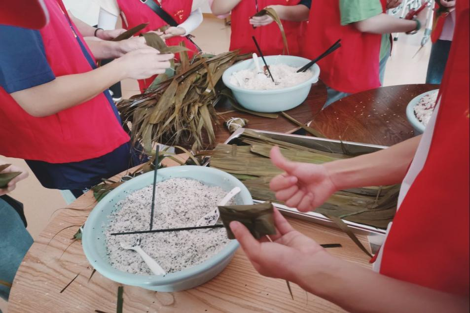 到达目的地,志愿者们测量好体温后,有序进入养老院,开始陪老人们聊天、看电视剧、打麻将、下象棋,还给老人捶腿按摩,喂水果。紧接着,在工作人员讲解演示后,一部分志愿者开始现学现用,开始给老人们准备过节吃的粽子,一片片箬叶摇身一变,成了香醇的粽子。养老院内一片欢声笑语,志愿者们即使是在外求学也感受到了家一般的温暖。临走时,养老院还给大家送了一大袋煮熟的粽子,不舍挥手告别。