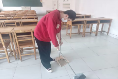 本次活动将骨干班成员原有小组重新划分成若干个小组,每个小组3到4人,以两层楼内各间教室为单位,各个小组按照自己所分配的教室进行打扫活动。活动进行的如火如荼,小组内成员有序分工,力求抹净桌面,擦净灰尘,扫净地板,清净抽屉,拖净地面。“五净”理念根生在每一位成员心里。