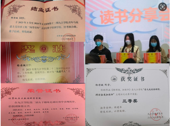 在思想政治方面,杨诗敏始终保持高度的政治觉悟和坚定的理想信念。她积极参加各类党团活动,深入学习党的理论知识,不断提高自己的政治素养。作为中共预备党员,她时刻以党员的标准严格要求自己,积极参加党支部组织的各项活动,发挥党员的先锋模范作用。她还曾参加2023年青年马克思主义者培养工程,获得结业证书及“优秀学员”称号。