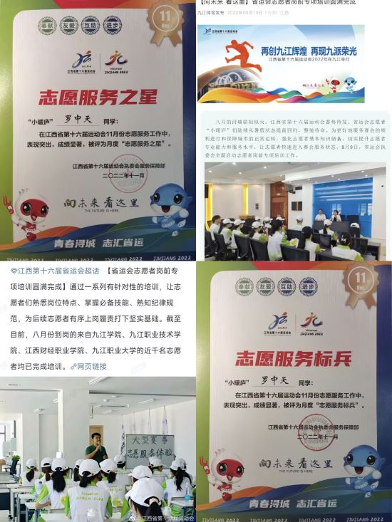他秉持初心,热衷于社会志愿服务工作,总志愿时长171.7小时,先后参与多项志愿服务工作,如“老员工返家乡”、“九江飞扬流浪动物领养活动”、“江西省第十六届运动会”等志愿活动。担任江西省第十六届运动会志愿者期间,服务于“九江市体育中心”,“九江市体育中心游泳馆”,“九江市省运会执委会信息技术部”,“九江市八里湖南湖”等多项体育赛事区域。其团队无私奉献的精神被微信公众号、微博、抖音等各大主流媒体广为报道。该同学本人也荣获此次江西省第十六届运动会“志愿服务标兵”、“志愿服务之星”双项嘉奖。其志愿活动工作事迹不仅受到江西省第十六届运动会部门老师与同学们的认可,同时也被公司所表彰,荣获伟德国际体育官网青年志愿服务“先进标兵”荣誉称号。