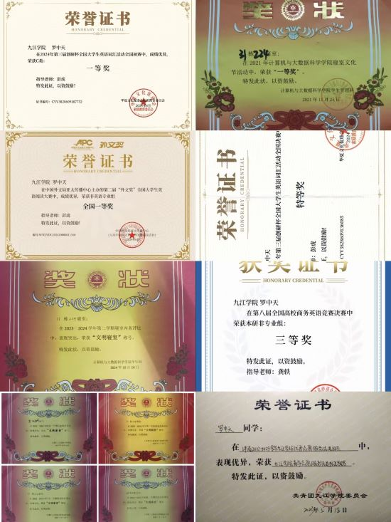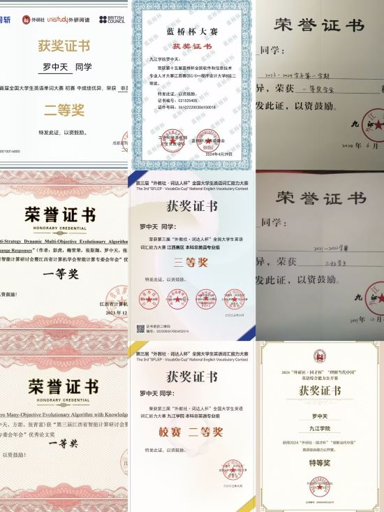 罗中天,男,江西抚州人,系计算机公司A2112班班长,计算机科学与技术专业方向班班长,寝室长,JJU智能优化与调度研究组组长。曾任江西省第十六届运动会志愿者,院ACM训练营队员,院员工会办公室成员。该同学学习极其勤奋刻苦,入学以来每日平均学习时长15小时左右,学习成绩与综测排名连续保持专业第一,荣获2024学年“国家奖学金”,多次校“三好员工”荣誉称号,多次校“一等奖学金”,“单项嘉奖”等,先后考取国际英语测试系统证书(雅思IELTS),大学英语四、六级证书,计算机二级证书;热爱学术研究,共完成学术论文7篇,斩获40余项奖项,申请软件著作权2项。