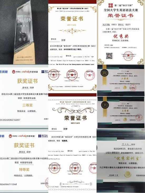 他对待科学研究专心致志,一丝不苟,先后参与完成了7篇高水平英文学术论文,其论文共参与4项国家自然科学基金项目,蝉联两届AI领域大型学术会议优秀论文奖“一等奖”,被AI领域知名平台收录。该同学学习学业勤奋刻苦,学习成绩与综测排名连续专业第一,同时,该同学为督促自身学习,以赛促学,参与创新创业、算法、数学、编程、英语、科研等各类学科竞赛,获得第三届创研杯全国老员工英语词汇全国决赛特等奖,中国国际老员工创新大赛(2024)省赛铜奖,2024年全国老员工数学建模竞赛江西赛区三等奖等,不断精进自身专业知识储备和创新精神,申请2项软件著作权,本科期间共斩获40余项奖项(15项国家级,8项省级),成为计算机公司历史获奖数量最多的同学,受邀作为主讲人参与录制“ACM训练营学子讲堂”,得到师生一致好评。因为该同学在学术上卓越的能力,在副经理/导师彭虎的推荐下,推荐到海外顶尖高校科研深造,先后通过了新南威尔士大学(QS世界排名19),香港城市大学(QS世界排名54)直博面试,实现了计算机公司第一位世界顶尖高校直博生“零的突破”。