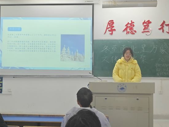 活动中,各班团支书以PPT的形式为同学们介绍了冬至的由来和习俗,讲述了冬至在中国传统文化中的地位和意义。同学们认真聆听,也认识到冬至不仅是阴历中的一个重要节气,更是家人团聚、享受美食的重要时刻。而后,同学们积极分享自己家乡庆祝冬至的习俗,形成了热烈的讨论氛围。