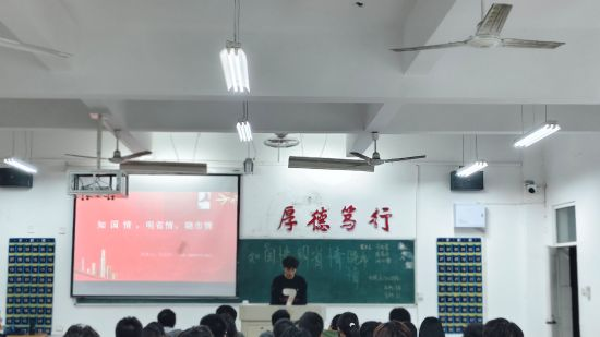 活动现场,主持人以“国情·省情·市情”为脉络,通过PPT演示、数据图表解析与案例分享,讲解了我国在科技攻关、乡村振兴等领域的重大成就,详细介绍了江西省在生态文明建设、产业升级中的发展特色,以及九江市作为长江经济带重要节点城市的战略定位与发展规划。在互动环节,同学们围绕“青年如何助力地方发展”展开热烈讨论,结合专业知识提出诸多创新性思路,现场氛围活跃而热烈。