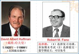 (2)哈夫曼的生平事迹及算法产生的背景:戴维.哈夫曼,1925年出生于美国俄亥俄州一个非常普通的家庭。在他27岁攻读博士学位的期间,他的导师Fano教授出了一道选择题:你可以选择复习功课,参加期末考试,也可以选择提交一篇学期论文,就可以免考。Fano教授针对学期论文布置的问题如下:寻找最有效的二进制编码。由于无法证明哪个已有编码是最有效的,哈夫曼放弃对已有编码的研究,转向新的探索,最终发现了基于二叉树结构的哈夫曼编码。哈夫曼除了发明了哈夫曼编码,在其他方面也有创新,比如他设计的二叉最优搜索树被认为是同类算法中效率最高的。日常生活中的哈夫曼喜欢折纸,他将折纸艺术与数学结合起来,把一张张普通的白纸变成了艺术品。
