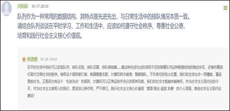 通过引入日常生活中的排队现象:食堂打饭、超市购物结账、进火车站、核酸检测等,引出队列的基本概念,通过观察现实生活中的排队现象,了解队列“先进先出”的特点及队列的作用。 在讲解队列的过程中,让员工意识到秩序的重要性,课堂上要遵守课堂秩序才能保证教学的有序进行,企业员工要遵守企业的规章制度才能保证生产的正常进行,行人、车辆只有遵守交通法规才能保证交通有序、安全地运行。 |
