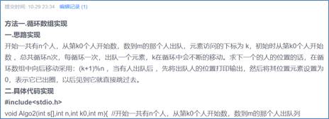 课后任务:约瑟夫环(约瑟夫问题)是一个数学的应用问题,已知n个人(以编号1,2,3...n分别表示)围坐在一张圆桌周围。从编号为k的人开始报数,数到m的那个人出圈;他的下一个人又从1开始报数,数到m的那个人又出圈;依此规律重复下去,直到剩余最后一个胜利者。请利用所学的数据结构(如:顺序表、链表、队列等)解决约瑟夫问题,尽可提供多种解决方案,给出算法设计思路,算法效率分析、代码及运行结果截图。