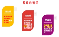 程序的错误有哪些? (思政元素:引导员工编写程序要有严谨的态度,碰到错误时要耐心调试) 1.语法出错:编译时发现。 2.语义出错:运行时发现。 3.逻辑错:运行结果不正确。
